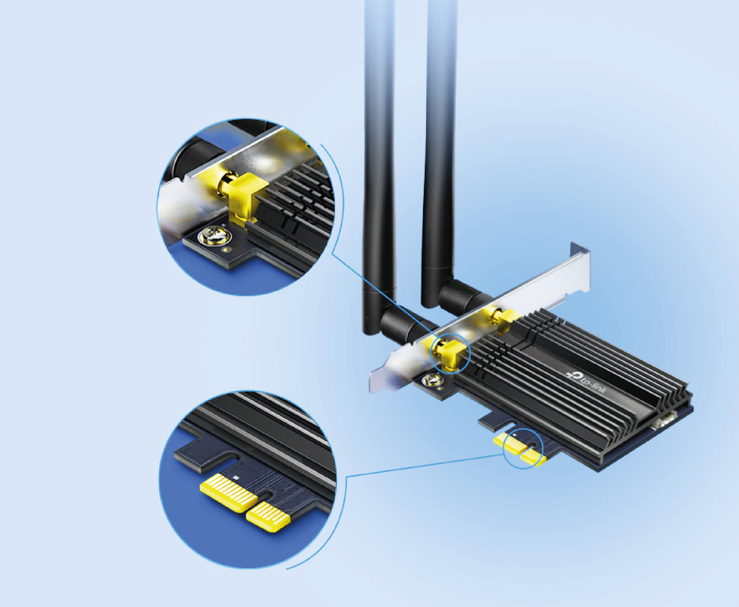 Karta sieciowa TP-Link Archer TX50E to dwupasmowy, bezprzewodowy adapter w formacie PCI Express (PCIe), obsługujący standard Wi-Fi 6 (802.11ax) i zapewniający łączną teoretyczną przepustowość AX3000. Przepustowość ta jest rozdzielona na pasmo 5 GHz (do 2402 Mb/s) oraz pasmo 2.4 GHz (do 574 Mb/s). Karta wykorzystuje technologię OFDMA oraz 1024-QAM w celu zwiększenia efektywności i zmniejszenia opóźnień. Jest ona wyposażona w technologię MU-MIMO, która umożliwia jednoczesną komunikację z wieloma urządzeniami. Ponadto, karta integruje funkcjonalność Bluetooth 5.0, zapewniając szybsze prędkości transmisji i większy zasięg w porównaniu do poprzednich wersji. Do zestawu dołączony jest niski profil śledzia (low-profile bracket), umożliwiający montaż w obudowach typu Small Form Factor (SFF). Za stabilność połączenia odpowiadają dwie zewnętrzne anteny. Wymaga wolnego slotu PCIe x1 oraz podłączenia wewnętrznego kabla USB 2.0 do obsługi funkcji Bluetooth.