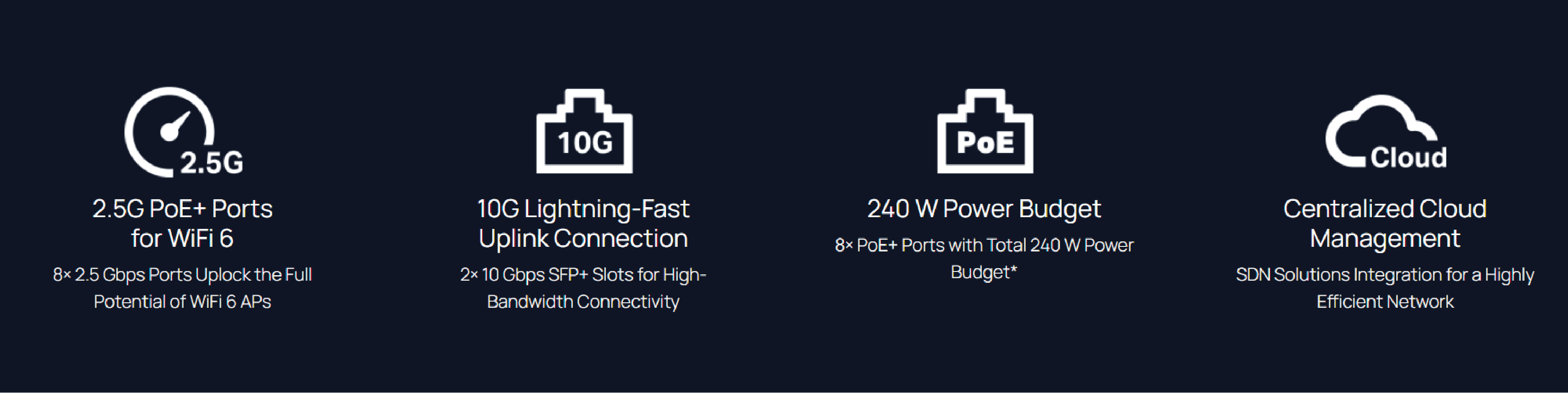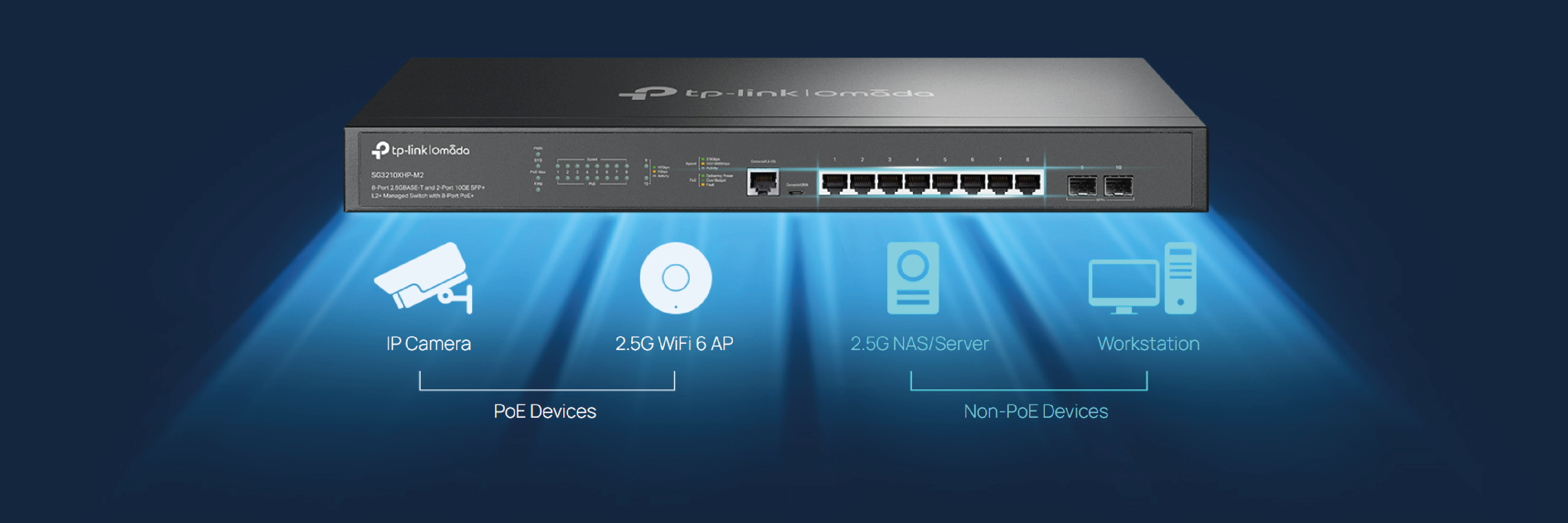 SG3210XHP-M2 to zarządzalny przełącznik sieciowy warstwy L2+ JetStream zintegrowany z systemem Omada SDN, przeznaczony dla środowisk wymagających wysokiej przepustowości oraz zasilania PoE o dużej mocy. Urządzenie jest wyposażone w 8 portów 2.5 Gigabit Ethernet (2.5G), wszystkie wspierające standard PoE+ (802.3at/af), z łącznym budżetem mocy PoE wynoszącym 240 W (do 30 W na port). Dodatkowo, przełącznik posiada 2 sloty SFP+ 10 Gigabit (10 Gb/s), które służą jako porty uplink do szybkiego połączenia z siecią szkieletową lub serwerami. Przełącznik obsługuje funkcje L2/L2+, w tym statyczny routing, VLAN 802.1Q, agregację łączy LACP oraz zaawansowane mechanizmy Quality of Service (QoS). Całkowita przepustowość przełączania wynosi 80 Gb/s. Dzięki integracji z Omada SDN umożliwia centralne zarządzanie w chmurze. Urządzenie jest przystosowane do montażu w szafie Rack 13 cali i wyposażone w system aktywnego chłodzenia (wentylatory).