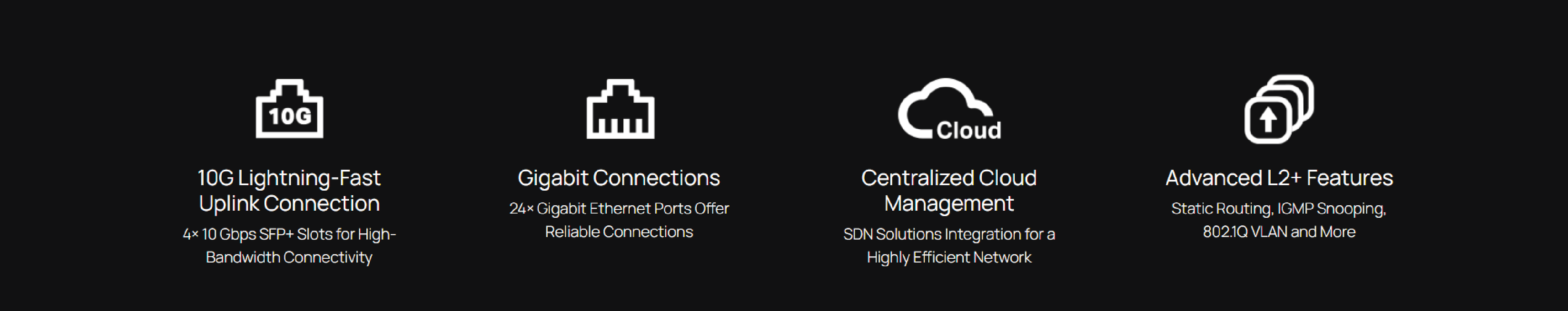 Wspierana jest kompletna linia funkcji L2+, w tym 802.1Q VLAN, Dublowanie Portów (Port Mirroring), STP/RSTP/MSTP, Protokół Kontroli Agregacji Łącz (LACP) oraz 802.3x Flow Control. Zaawansowany IGMP Snooping zapewnia, że przełącznik inteligentnie przekazuje strumienie multiemisji tylko do odpowiednich subskrybentów, eliminując niepotrzebny ruch, podczas gdy IGMP throttling & filtering (ograniczanie i filtrowanie IGMP) ograniczają każdego subskrybenta na poziomie portu, aby zapobiec nieautoryzowanemu dostępowi multiemisji. Routing Statyczny to prosty sposób na segmentację sieci i wewnętrzne kierowanie ruchem przez przełącznik w celu poprawy wydajności.