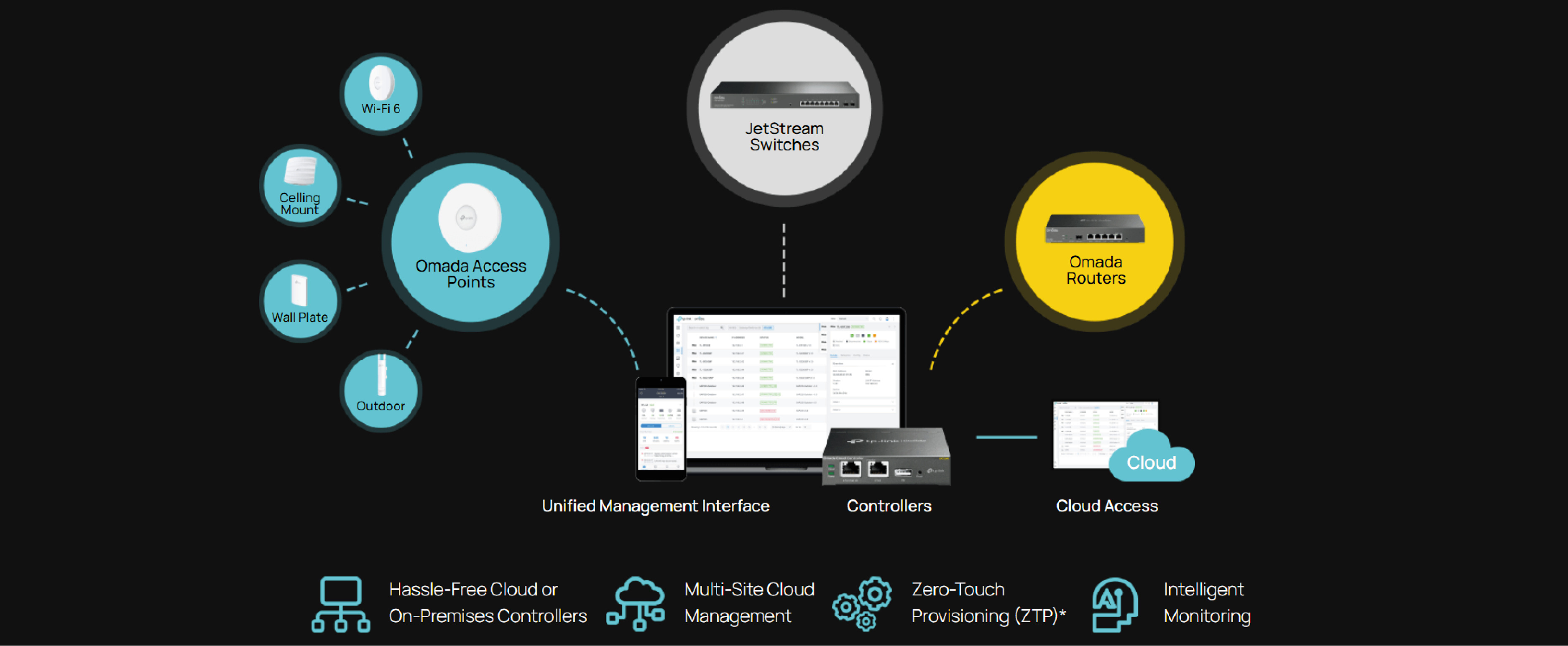 | Funkcje zaawansowane | Obsługa kontrolerów sprzętowych Omada (OC200/OC300), kontrolera programowego, kontrolera opartego na chmurze Automatyczne wykrywanie urządzeń Konfiguracje grupowe Grupowe aktualizacje oprogramowania Inteligentne monitorowanie stanu sieci Ostrzeżenia o nietypowych zdarzeniach Ujednolicony proces konfiguracji Harmonogram restartu Bezobsługowa konfiguracja ZTP |